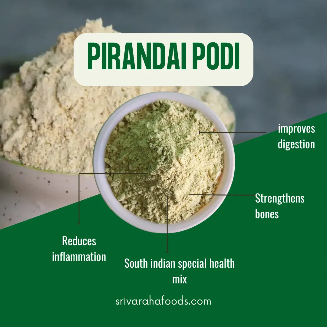 Pirandai Podi (Veldt Grape Powder / பிரண்டை பொடி) – Crafted with veldt grape (pirandai), lentils, pepper, cumin, and spices, this podi is well-known for its traditional health benefits. Pirandai helps improve digestion, strengthens bones, reduces inflammation, and supports joint health.